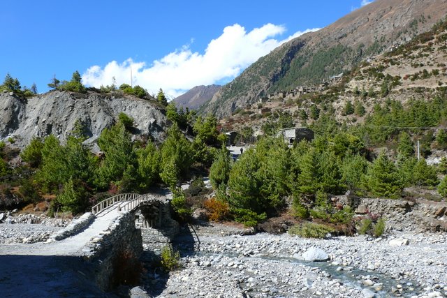Tego dnia weszlismy do dystryktu Manang. Tu zaczynaja sie naprawde niesamowite widoki. Idzie sie sciezka wzdluz doliny rzeki co jakis czas przechodzac na drugi brzeg po wiszacych mostach (lepiej sie na nich nie spotkac ze stadem oslow).